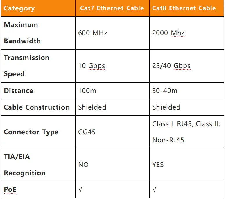 The main difference between Cat7 and Cat8 Ethernet cables is speed and frequency. Cat7 has a channel bandwidth of up to 10Gbps at a frequency of 600Mhz; Cat8 has a channel bandwidth of up to 40Gbps at a frequency of 2000Mhz.