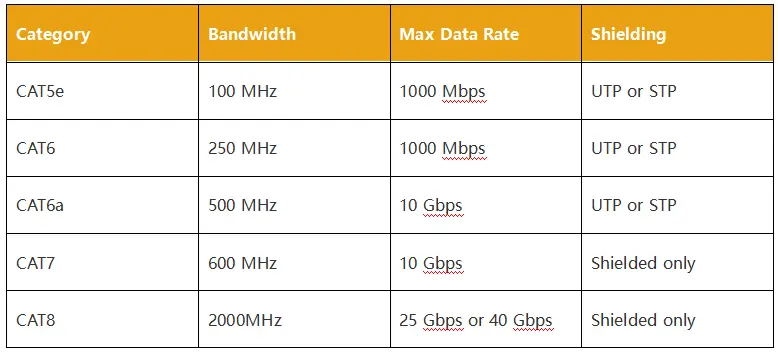 Frequency range: Cat8 cables are capable of transmission in a frequency range of 2000MHz, which is much larger than the frequency range of previous Ethernet standards such as Cat6 and Cat7.